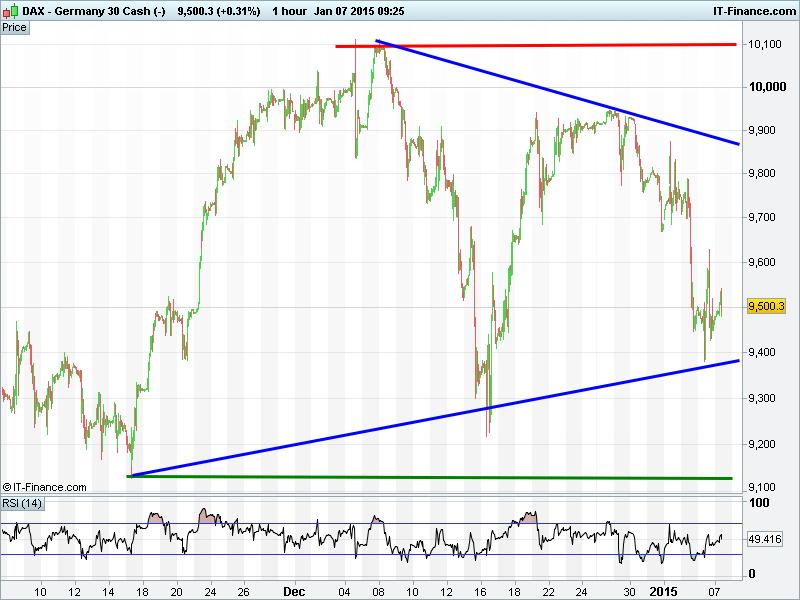Germany’s DAX found support at 9400 yesterday which means a possibility that it rebounds again within the confines of a narrowing wedge pattern with rising lows from November and falling highs from early December. RSI neutral.