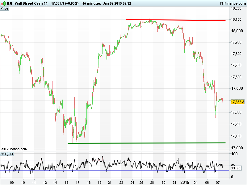 US Dow Jones still in a downtrend with momentum repeatedly lost following bounces (17750, 17500). Potential for retrace to December lows of 17045, but the 200-day moving average could come to the rescue around 17100 first. RSI not oversold yet.