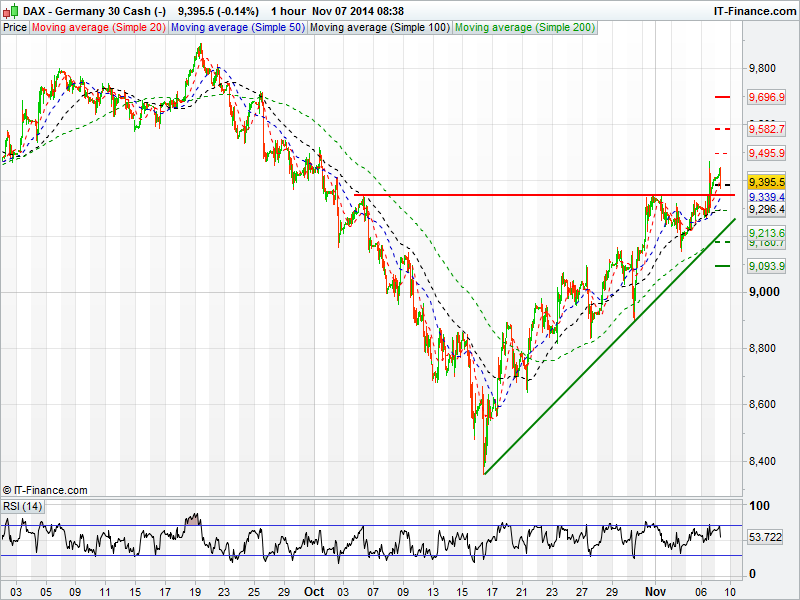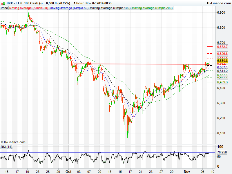 Germany’s DAX broke above its resistance level of 9350 yesterday to trade at 5 week highs. This level may now provide support as the 3 weeks uptrend continues to push on. The 50 day moving average has broken above the 100 day moving average although the RSI is in decline after falling from overbought territory. The DAX will now look to attack 9700 with relatively few resistance hurdles in the way until then.