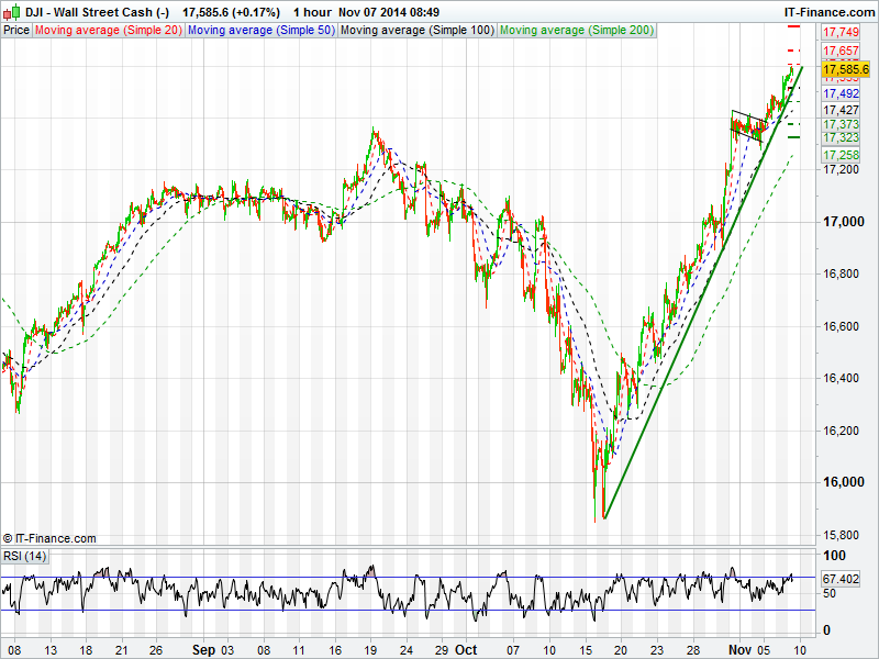 US Dow Jones registered yet another record high yesterday, firstly breaking into 17500’s before touching 17600 briefly overnight as the 3 week rally continues to remain strong. The Dow has now rallied 1800 points since last months lows and with today’s Non-farm payrolls it could well see 17700 too! Support should come into play along the rising trend line as well as the 50 and 100 day moving averages. The RSI has turned lower, falling from overbought territory.