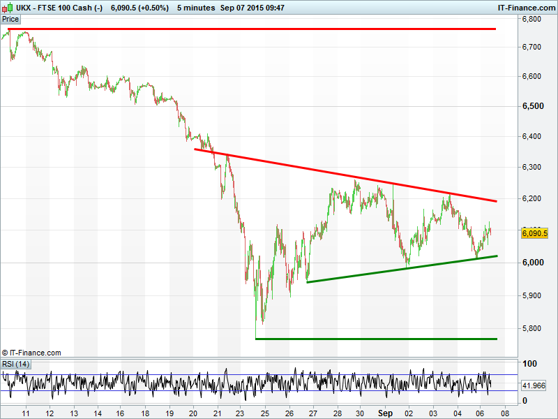 UK 100 now technically in narrowing pattern 6000-6200. A breakdown from this could lead to continuation of accelerated downtrend from 11 Aug. Rising lows from 5770 still valid but break above 6260 likely needed to convince of potential for bullish recovery.
