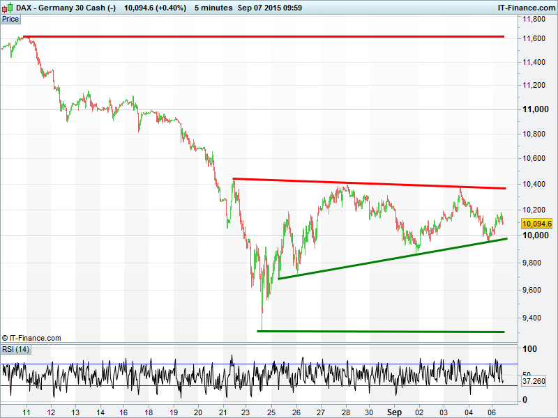 UK Index , Dax & Dow all now in 2-week narrowing patterns, a break down from which could result in continuation of existing downtrends. Gold trading just off 3-week support base of bearish wedge pattern which could lead to another leg down amid a longer term downtrend.