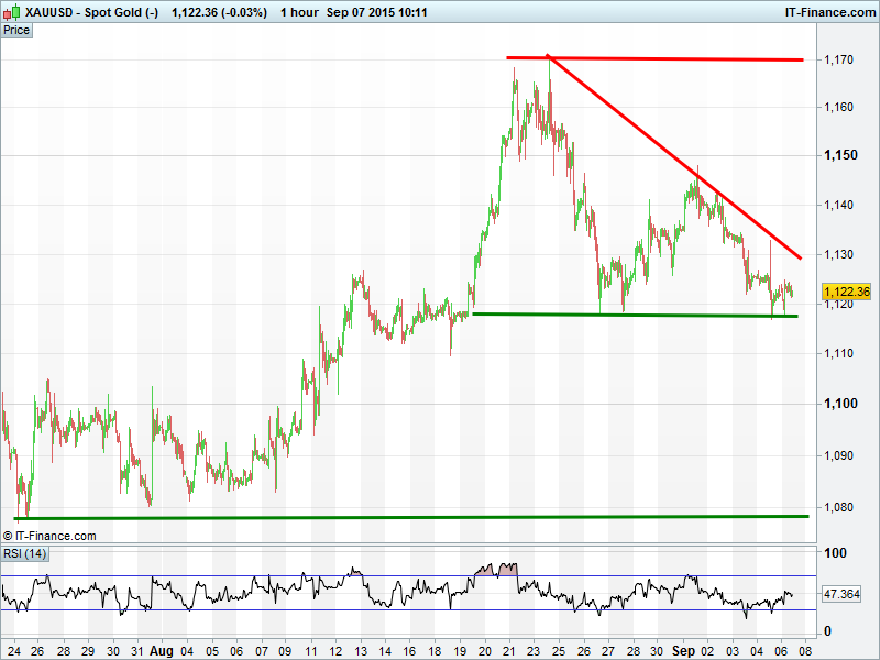 Gold trading around the base of a bearish descending triangle pattern a break down from which could lead to a revisit of 2015 lows, although $1116 has proved supportive for 3 weeks now. Can it manage a fourth and help with a break higher above falling highs?