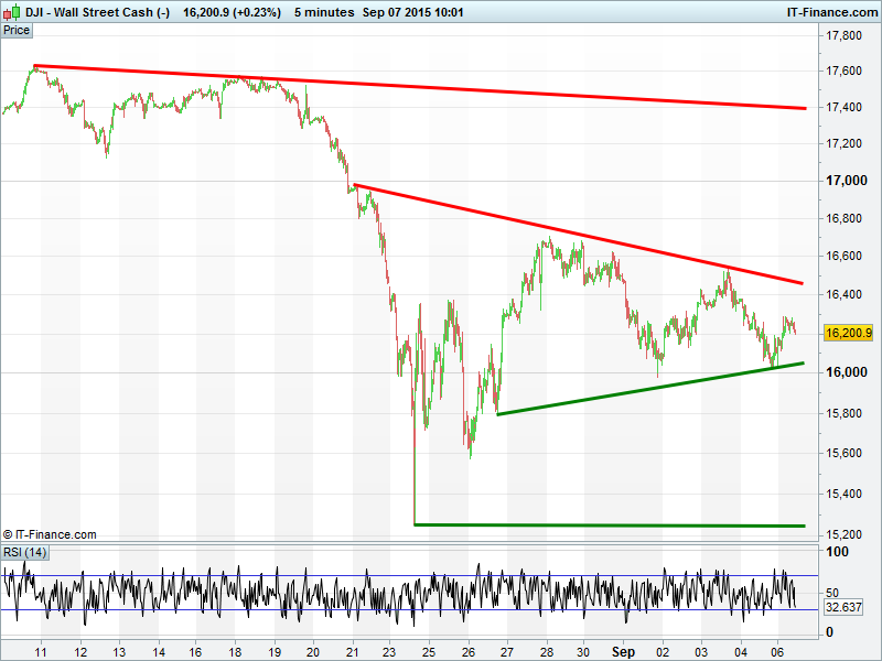 US Dow Jones futures now technically in converging pattern 16050-16450. A breakdown from this could lead to continuation of accelerated downtrend from 18 Aug while a breakout could be pre-cursor to recovery towards 1740. Like the UK Index , Rising lows from 23 Aug still valid but break above 16710 likely needed to convince of bullish recovery potential.