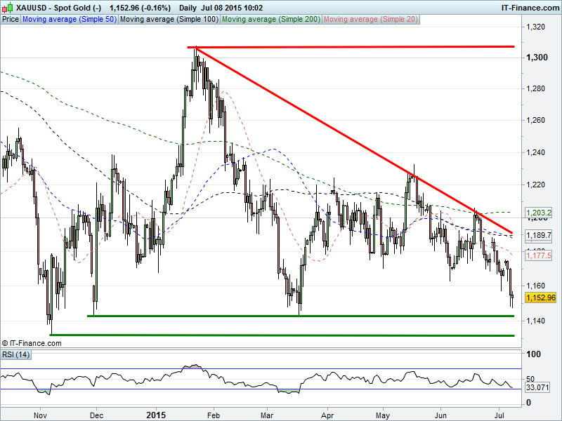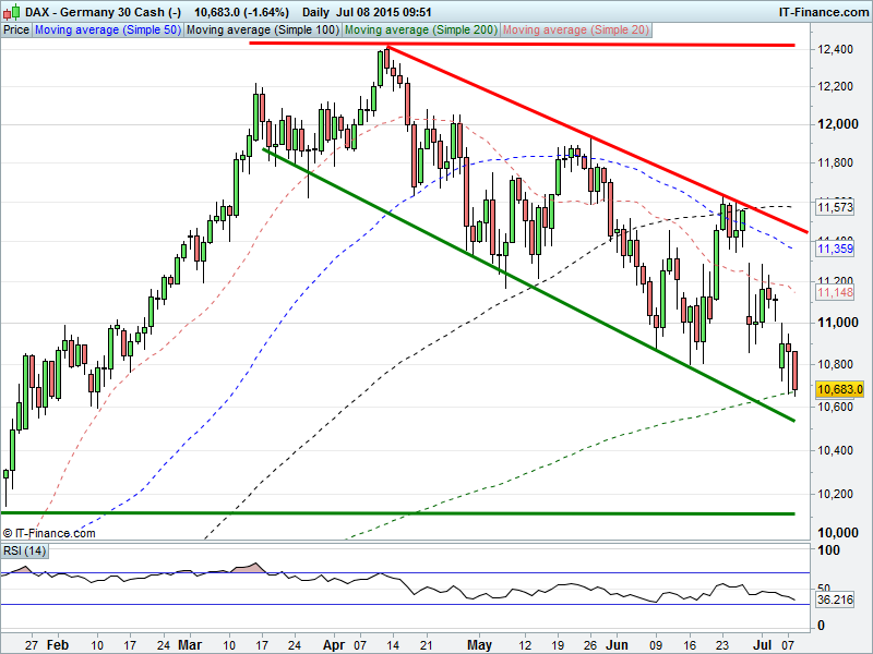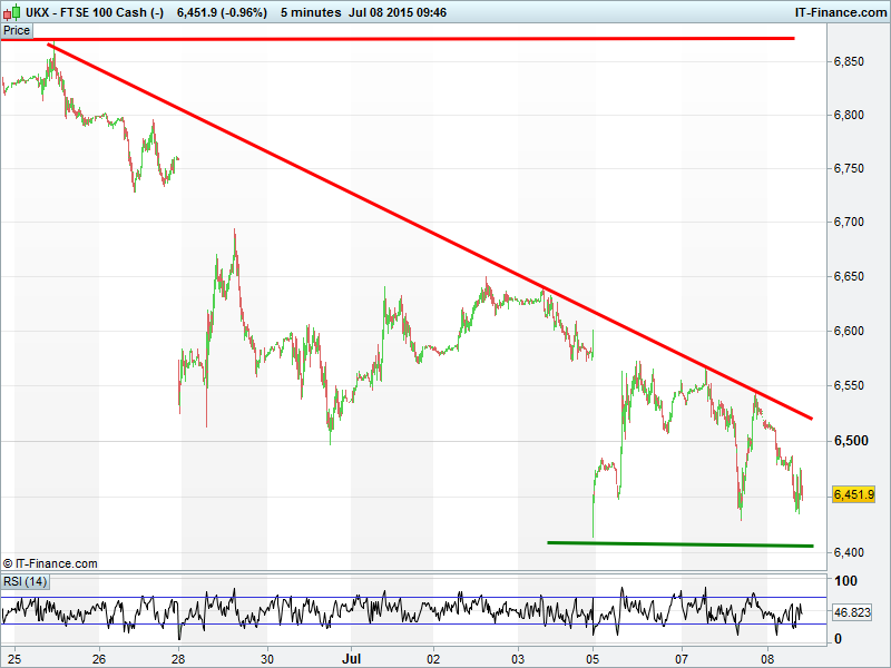 Equities very mixed this morning as we move into the latest (but supposedly last) period of wait and see on a Greek bailout deal. All, however, still struggling with short-term downtrends. EU leaders clear – this is your final chance to avoid exit from Eurozone. European equities positive suggests hope of progress before the weekend deadline but only just off recent lows. US markets in the red, reversing from their strong finish after Asia rocked overnight by another strong China sell-off despite continued fruitless intervention by regulators.