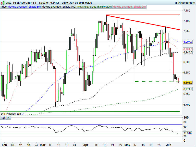 UK 100 languishing around recent lows after completion of bearish double-top pattern. 6800 to hold after sell-off, creating platform for bounce? Or merely a pause before retrace to 1 April lows 6670? Potential support from 200-day MA at 6772.