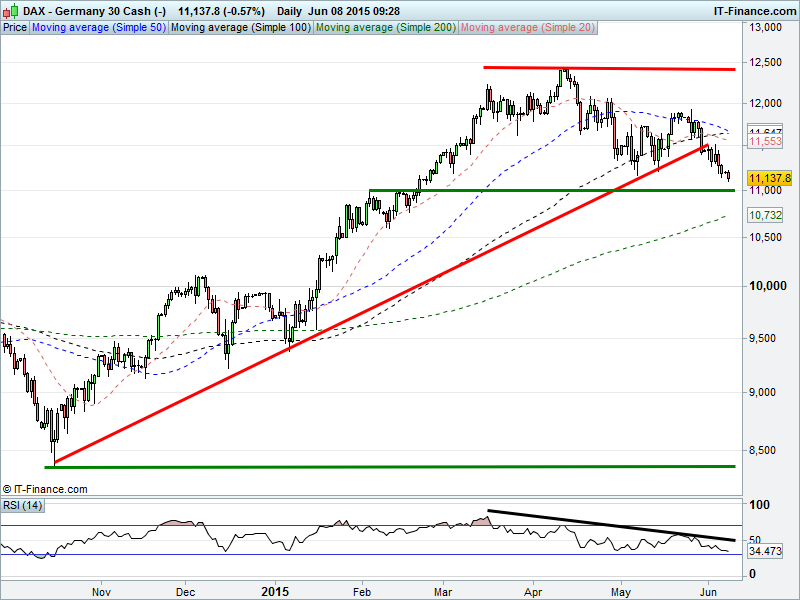 Germany’s DAX broken May lows to trade 3-month lows, maintaining downtrend from mid-May and early April. With long-term rising support a thing of the past, watch for 200-day MA 10732 for next support.