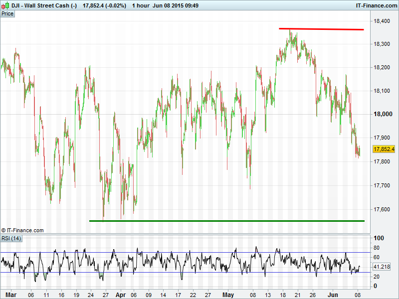 Equity markets trading around breakeven as they continue to digest Friday’s US Jobs report and its implications on the timing of a looming Fed rate rise. The Greek saga entering a new week is also serving to hold sentiment back, as is divergent interpretation of Asian data on central bank action (Japan good data bad for stimulus; China bad data good for stimulus). UK 100 holding around May lows 6800, DAX30 maintaining downtrend towards 11000, Wall St Futures found support around 17800 and Gold now held below $1180.