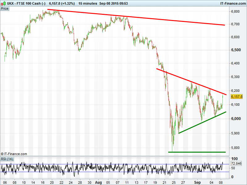 UK 100  still in narrowing pattern. A breakdown would likely mean continuation of accelerated downtrend from 11 Aug. Rising lows from 5770 still valid but break above 6260 needed before assuming full retrace of Aug losses.