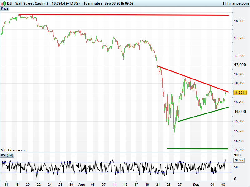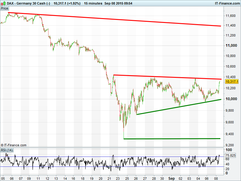 Germany’s DAX in a cross between narrowing pattern and a wedge. The former is a continuation pattern or exiting trend while the latter usually signals potential for bullish reversal.