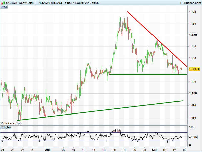 UK Index ,  Dax & Dow all still trading within confines of 2-week narrowing continuation patterns. A breakdown would likely see resumption of prevailing downtrends while a breakout bettering late Aug highs could deliver retracement of recent losses. Gold still hovering around $1120, still under pressure from Aug falling highs.