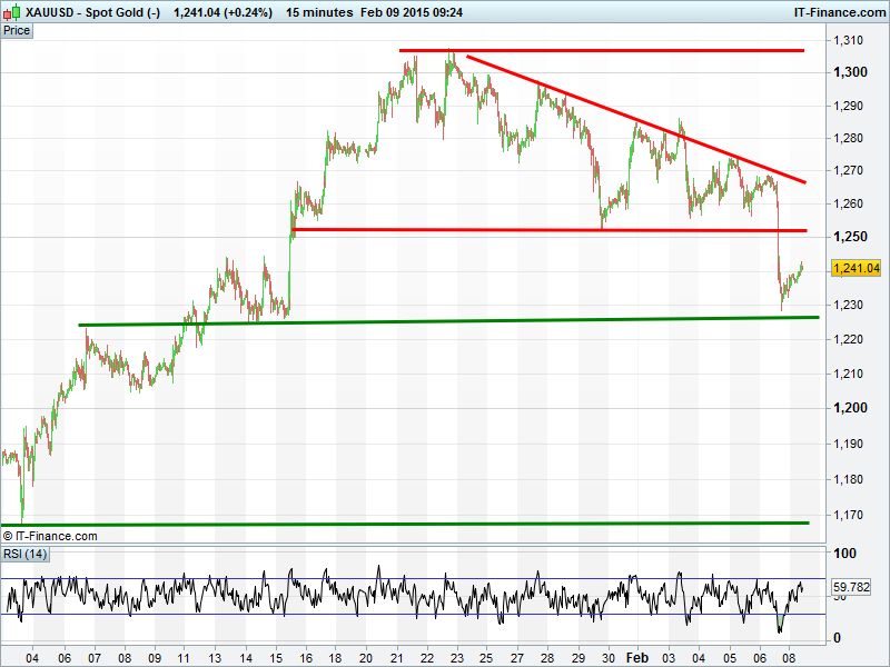 Gold broke below $1250 after the US jobs report (US$ up, risk appetite up), with support kicking in around $1230 which coincides with an intersecting trend line from October 2012. Still in a downtrend from 22-Jan. Watch for breached levels reverting to resistance on any rallies.