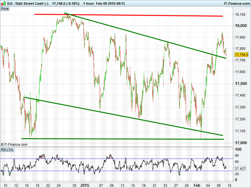 The US Dow Jones his back testing its 17750 breakout level of Thursday. If this serves as support there is potential for recovery to end-2014 highs of 18100. A break below would put it back within its 1-month falling channel (17040-17700).