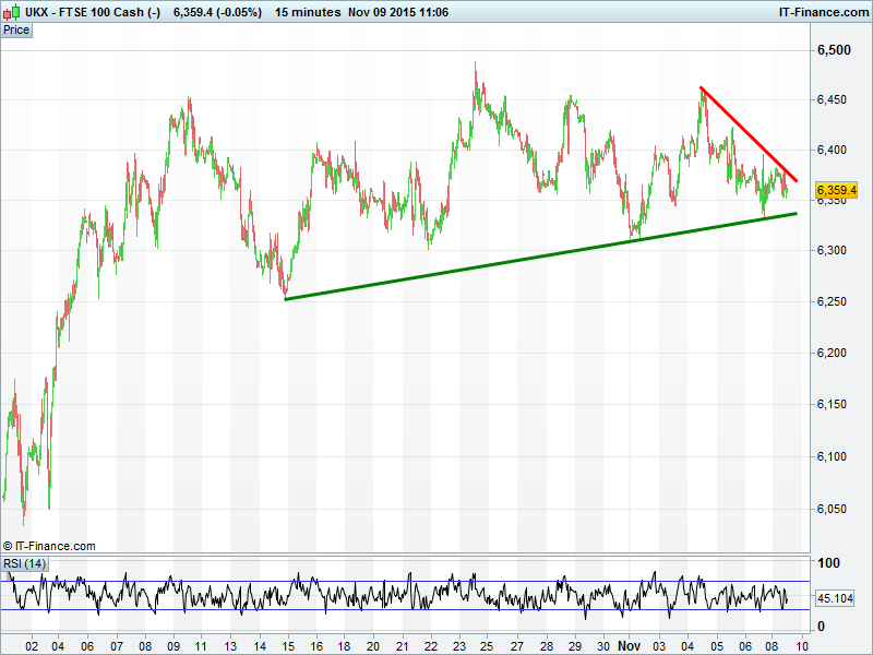 UK 100 fast approaching the apex of a 1-week converging pattern around 6350. Longer term, still potential for a breakout from bullish ascending triangle to send the index back towards 6700.
