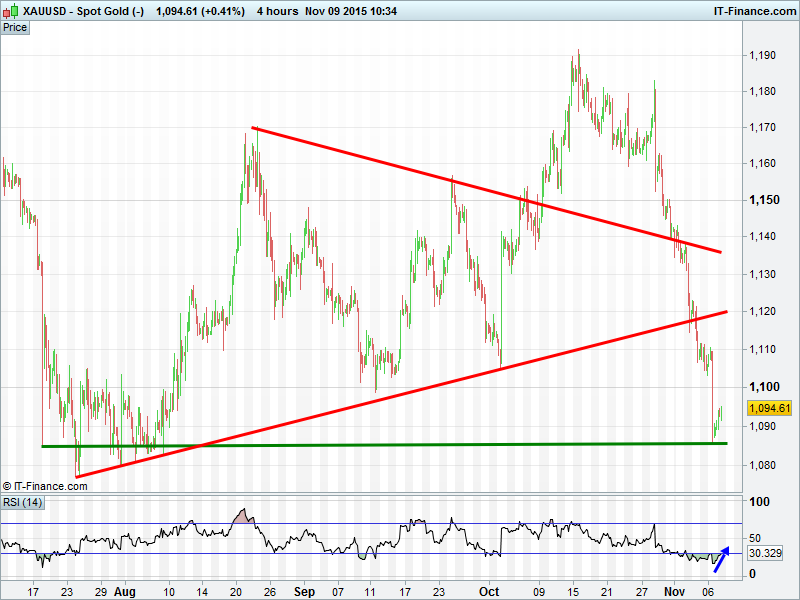 Gold found support around $1085 after extreme weakness in the face of a stronger USD. Uncertain whether the downtrend is over. Daily RSI off its oversold lows but yet to break out.
