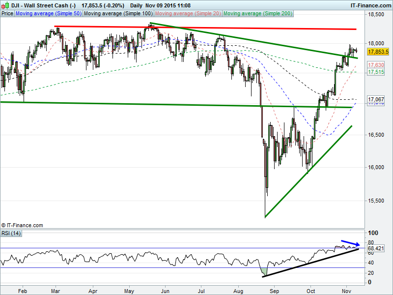 US Dow Jones futures taking a pause amid its strong uptrend. Having broken above shallow falling highs at 17800, potential for revisit of 18200. Note however, the RSI about to turn down from overbought and about to test rising support.