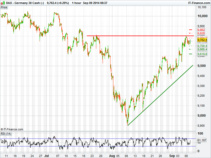 Germany’s DAX failed to break late July resistance of 9800 yesterday before losing the best part of 90 points. This morning we see the DAX making another run towards 9800, will it manage a break this time? The 1 month uptrend continues to remain intact, however, resistance at 9800 could prove difficult.