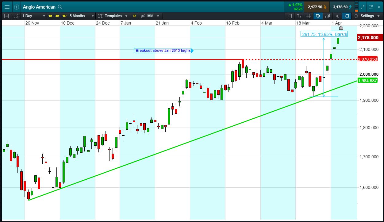 Let’s say the trend appeals to you, you think it’s likely to continue. You decide to buy exposure to £10,000 worth of Anglo American using a CFD, at the current price of 2178p. To do this, you need £2,000.
