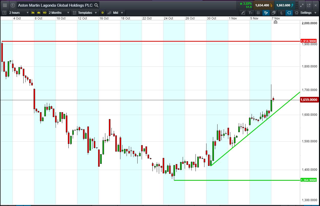 - The chart shows the Aston Martin price action since its IPO in early October.