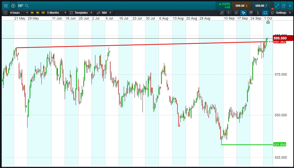 Let’s say the trend appeals to you, you think it’s likely to continue. You decide to buy exposure to £10,000 worth of BP using a CFD, at the current price of 600p. To do this, you need £2,000.