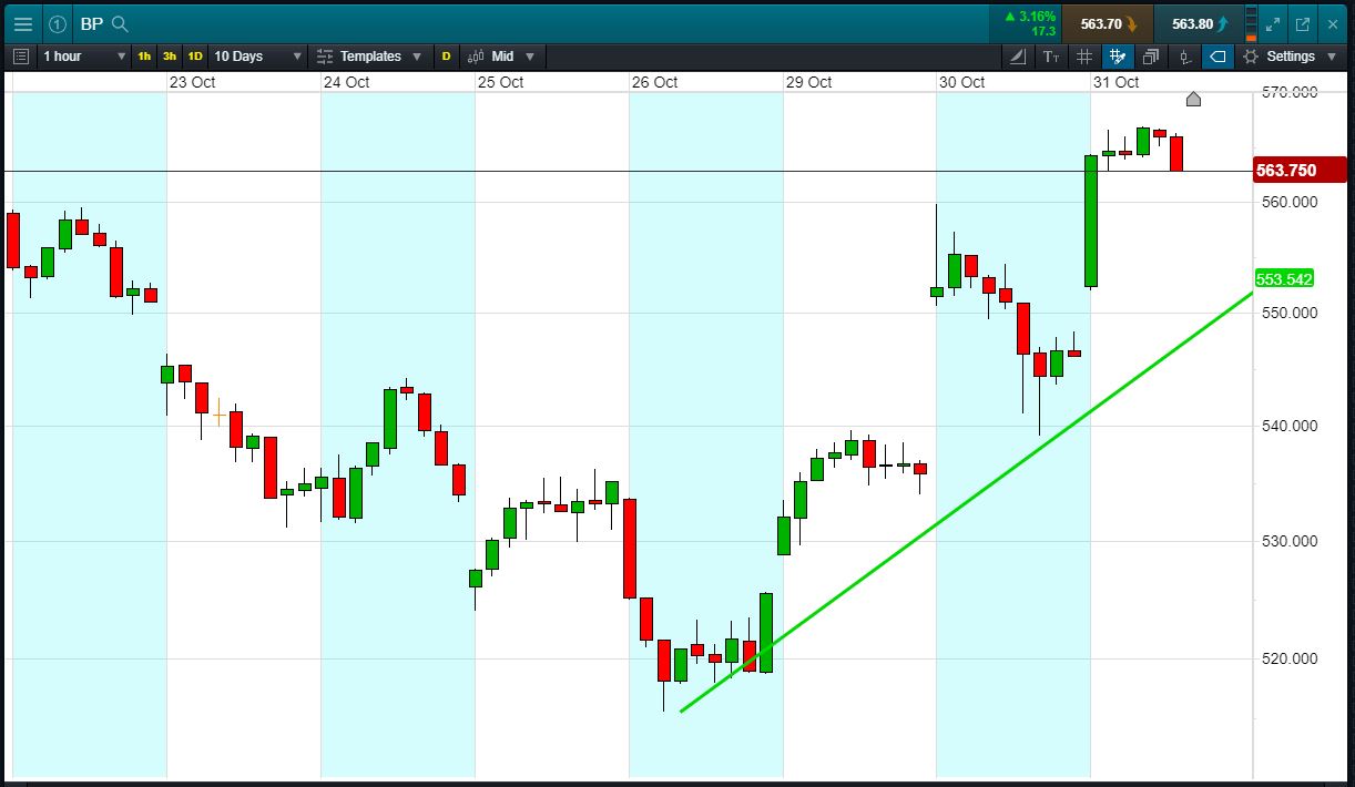 Let’s say the trend appeals to you, you think it’s likely to continue. You decide to buy exposure to £10,000 worth of BP using a CFD, at the current price of 563p. To do this, you need £2,000.