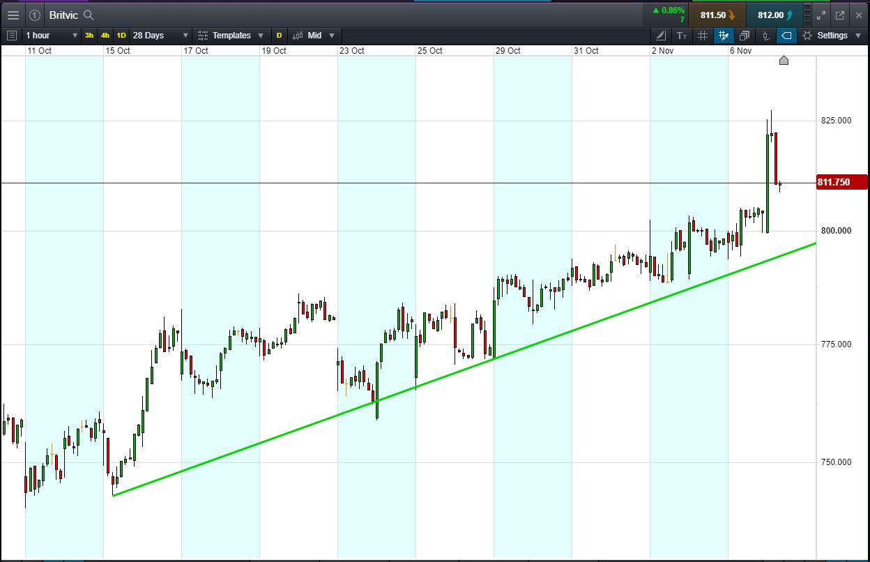 Let’s assume Britvic trend continues to the 843p summer high (+4%). Your profit would be £400, from your initial investment of £2,000.