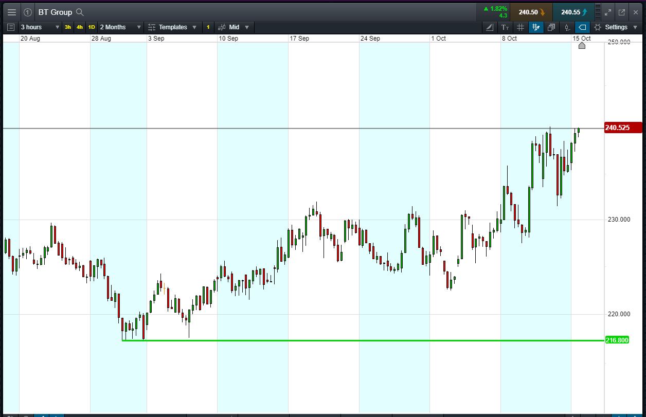 Let’s say the trend appeals to you, you think it’s likely to continue. You decide to buy exposure to £10,000 worth of BT Group using a CFD, at the current price of 240p. To do this, you need £2,000.
