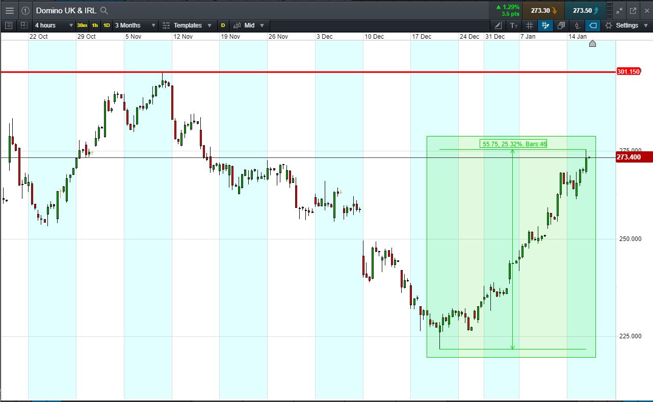 Let’s assume the Domino’s Pizza trend continues to November’s 301p highs (+10.2%). Your profit would be £1020, from your initial investment of £2,000.
