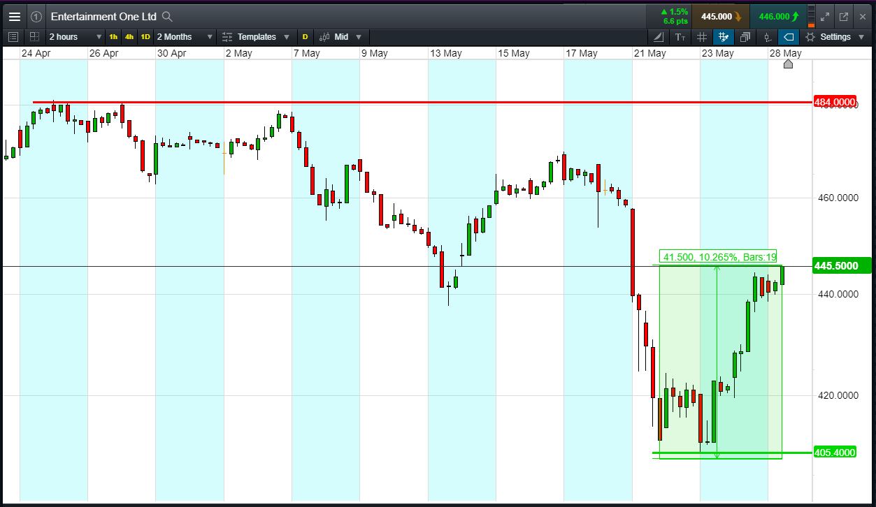 Let’s assume the Entertainment One trend continues to highs of 484p (+8.7%). Your profit would be £870, from your initial investment of £2,000.