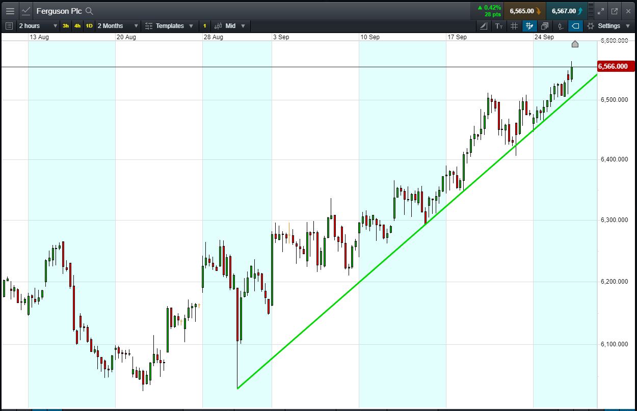 Let’s say the trend appeals to you, you think it’s likely to continue. You decide to buy exposure to £10,000 worth of Ferguson using a CFD, at the current price of 6,566p. To do this, you need £2,000.