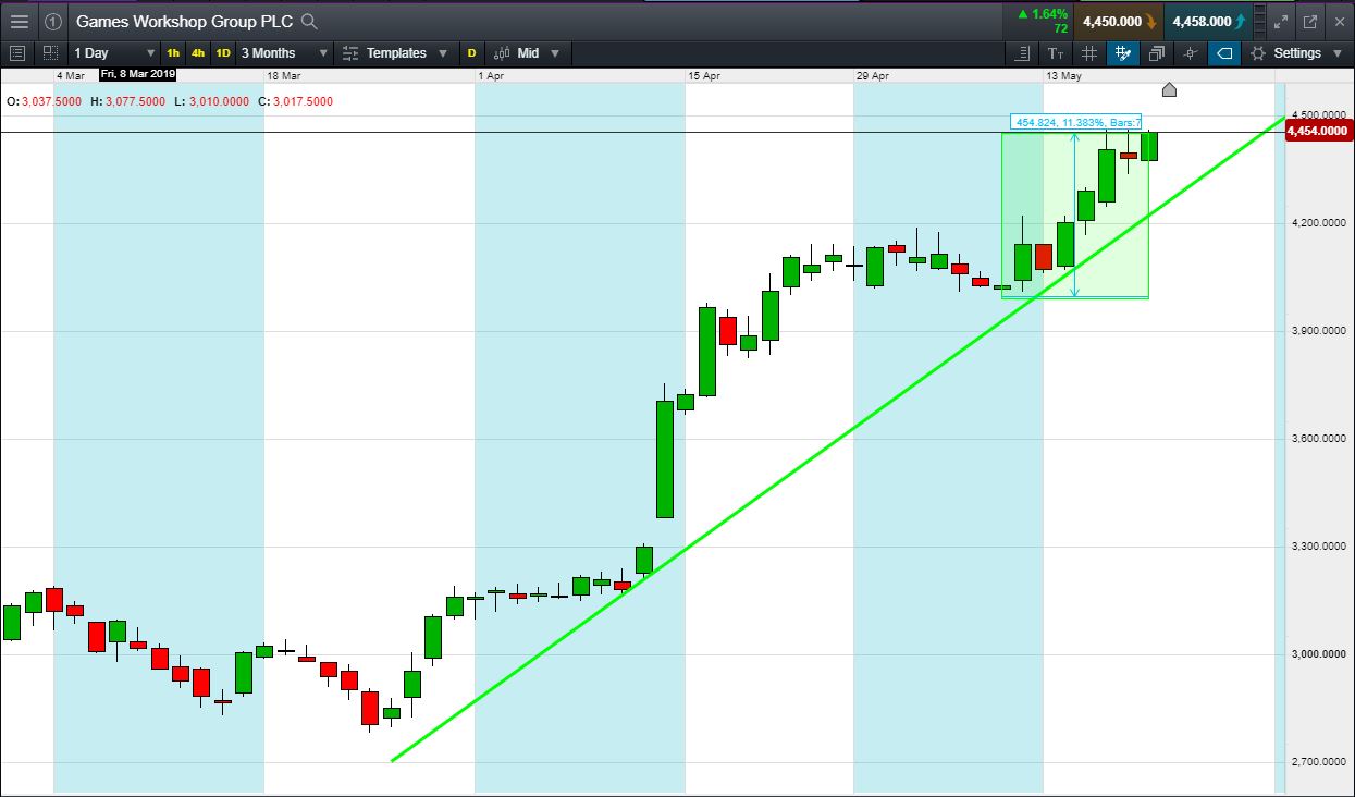 Let’s assume the Games Workshop trend continues to 5000p (+12.2%). Your profit would be £1160, from your initial investment of £2,000.