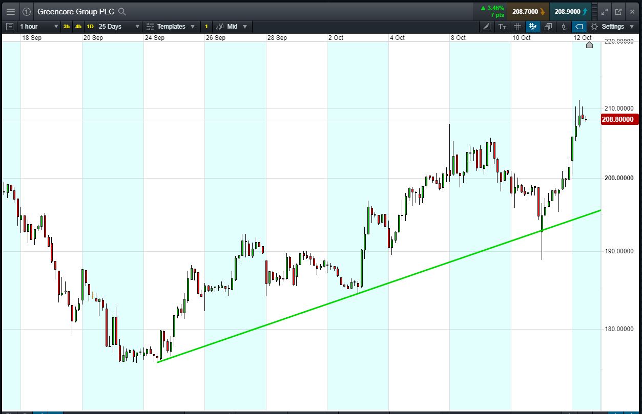 Let’s say the trend appeals to you, you think it’s likely to continue. You decide to buy exposure to £10,000 worth of Greencore using a CFD, at the current price of 208p. To do this, you need £2,000.