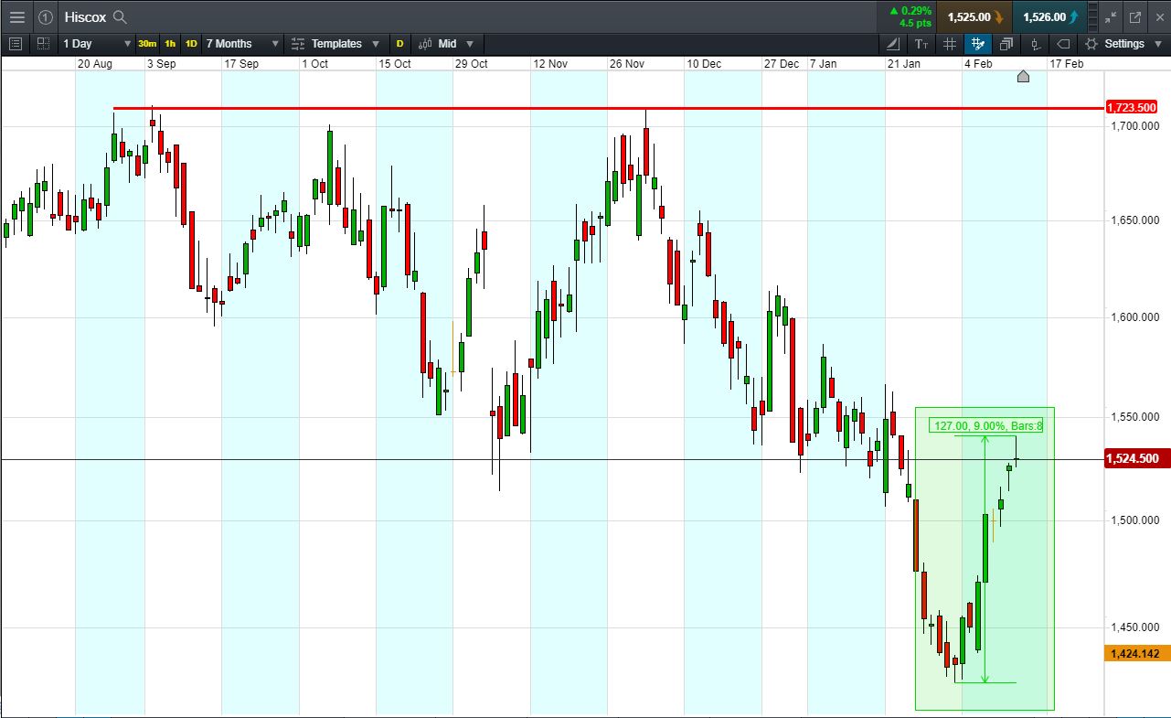 Will Hiscox turn, or will it maintain momentum to 1723p November highs?