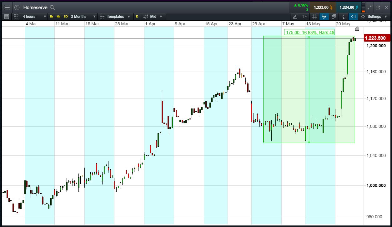Let’s say the trend appeals to you, you think it’s likely to continue. You decide to buy exposure to £10,000 worth of Homeserve using a CFD, at the current price of 1223p. To do this, you need £2,000.