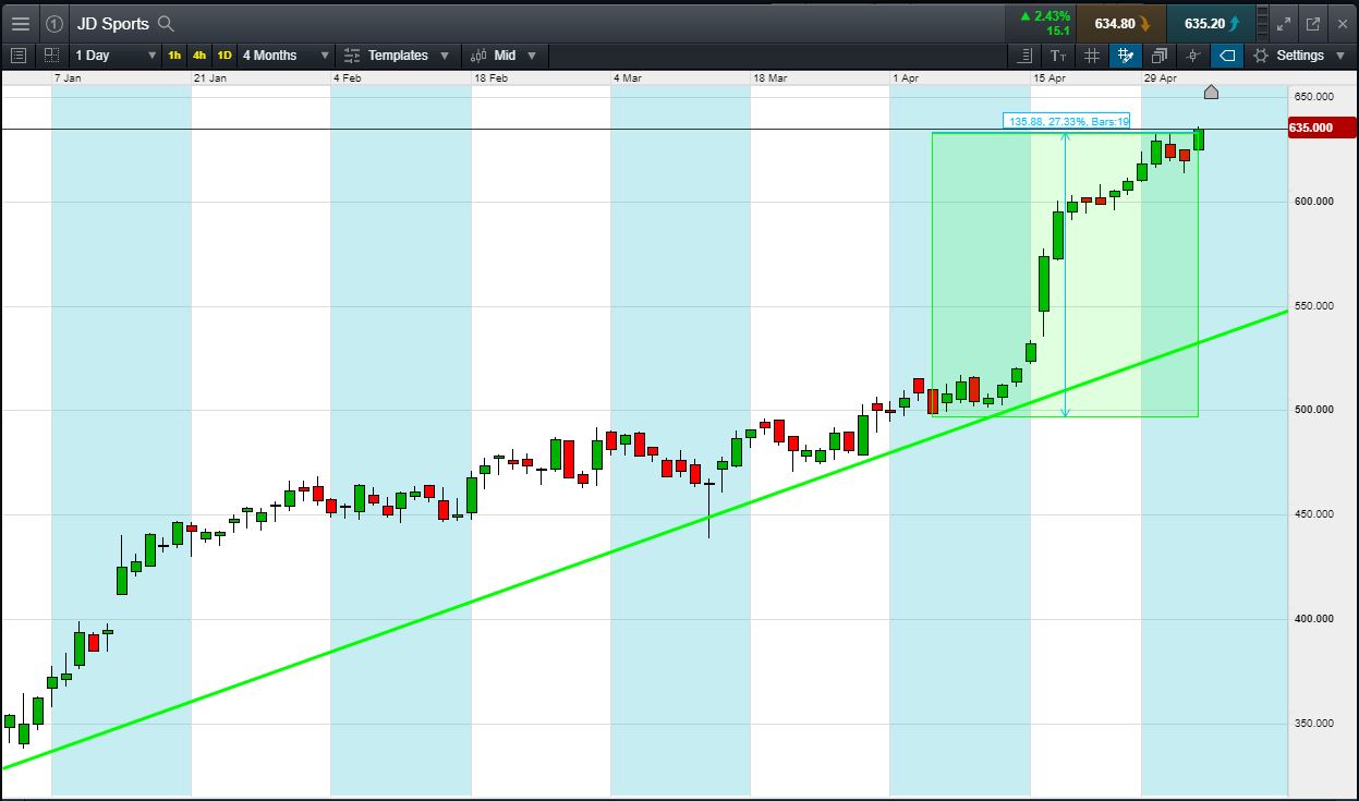 Will JD Sports turn, or will it continue to make new all time highs at 700p?