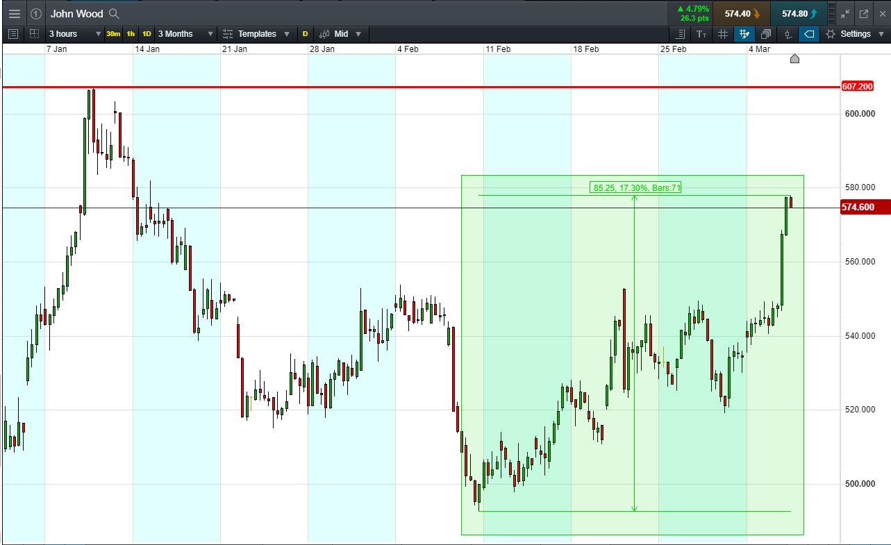 Let’s assume the John Wood trend continues to 607p (+5.7%). Your profit would be £570, from your initial investment of £2,000.