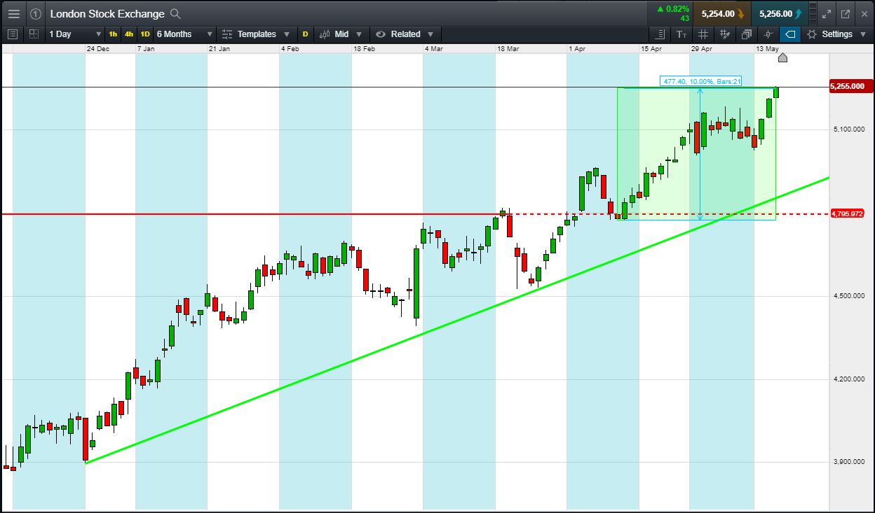 Let’s assume the LSE trend continues to new all time highs at 5800p (+10.3%). Your profit would be £1030, from your initial investment of £2,000.