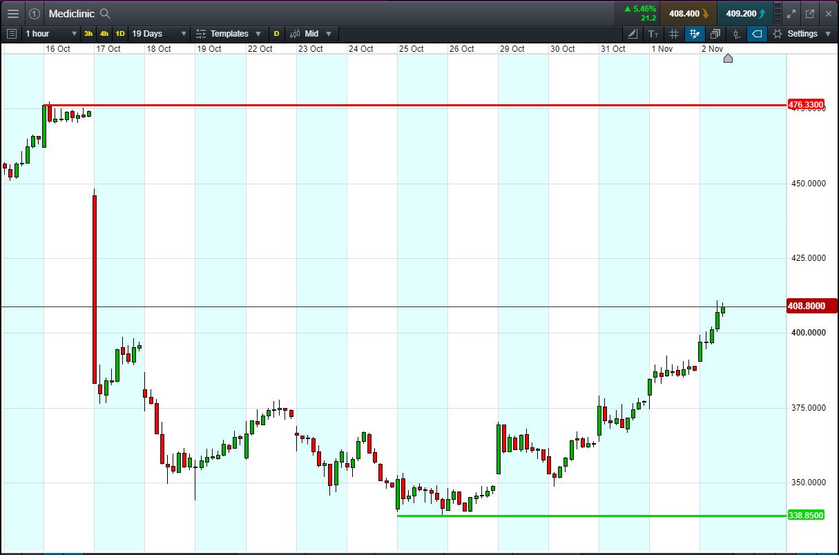 Will Mediclinic turn, or will it continue to rise beyond 476p October highs?