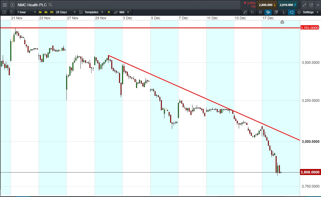 Let’s say the trend appeals to you, you think it’s likely to continue. You decide to sell exposure to £10,000 worth of NMC Health using a CFD, at the current price of 2808p. To do this, you need £2,000.