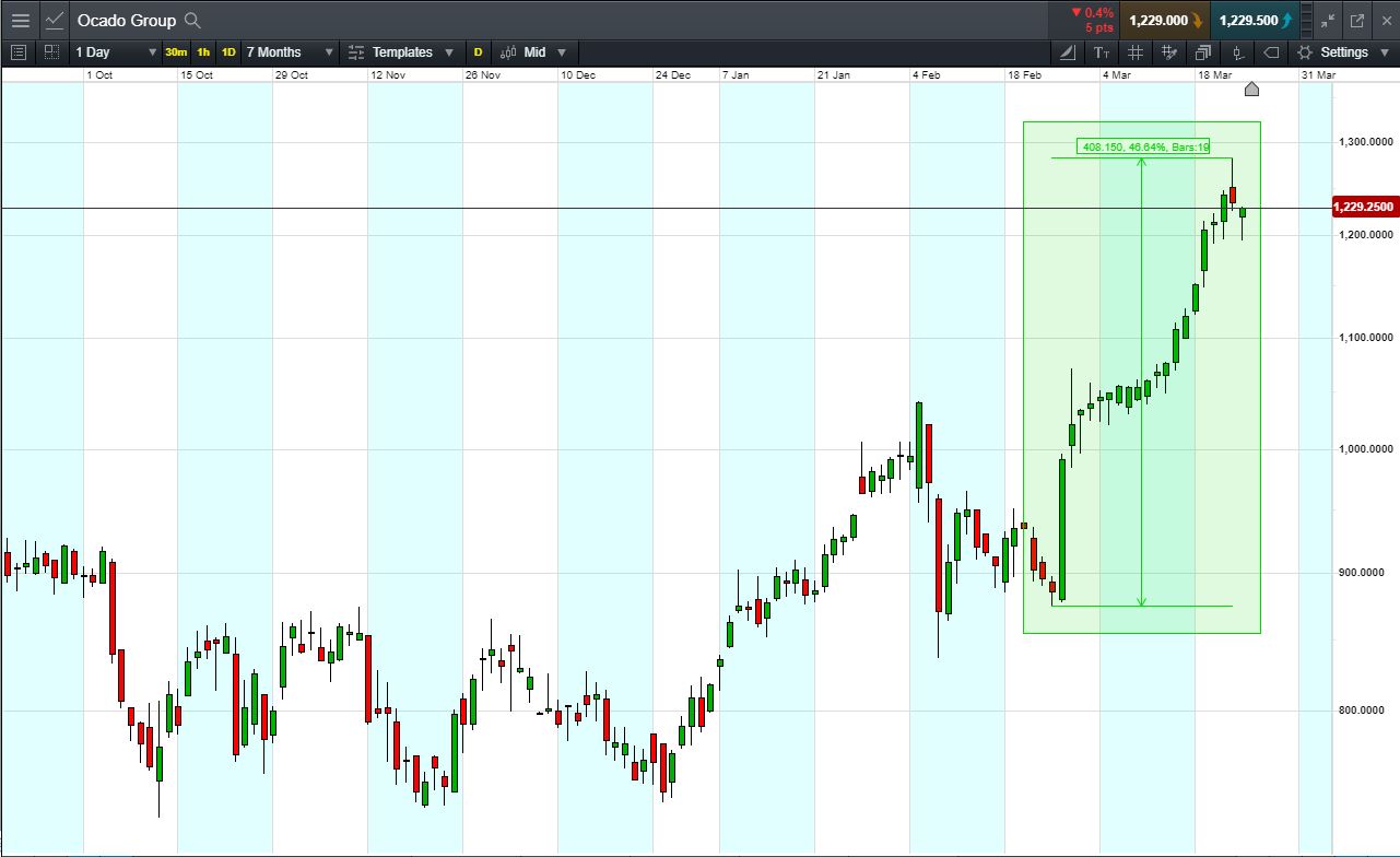 Let’s say the trend appeals to you, you think it’s likely to continue. You decide to buy exposure to £10,000 worth of Ocado using a CFD, at the current price of 1229p. To do this, you need £2,000.