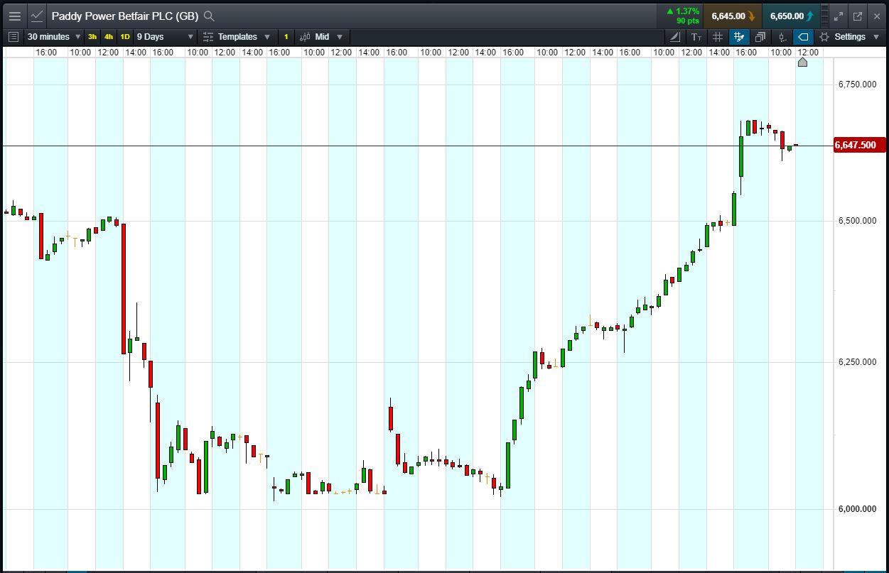Let’s say the trend appeals to you, you think it’s likely to continue. You decide to buy exposure to £10,000 worth of Paddy Power Betfair using a CFD, at the current price of 6,647p. To do this, you need £2,000.