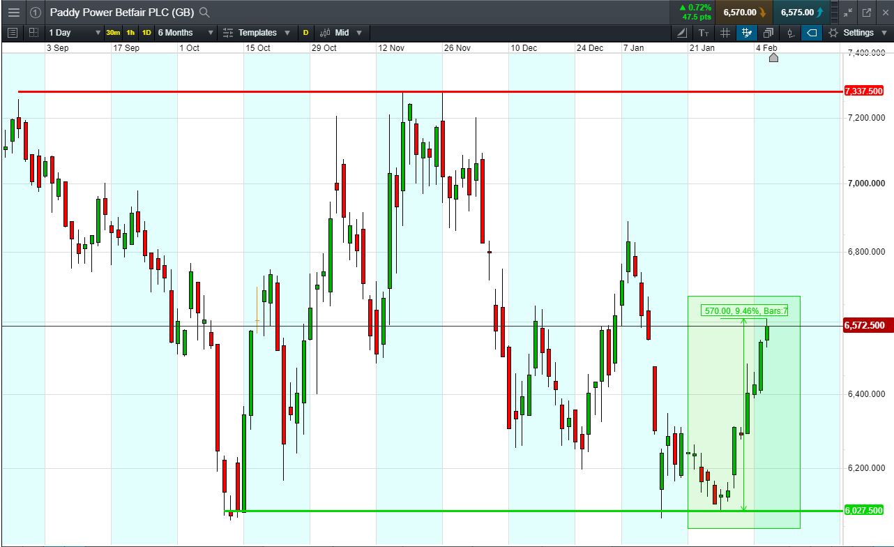 Will Paddy Power Betfair turn, or will it continue to rise to 7337p Nov highs?