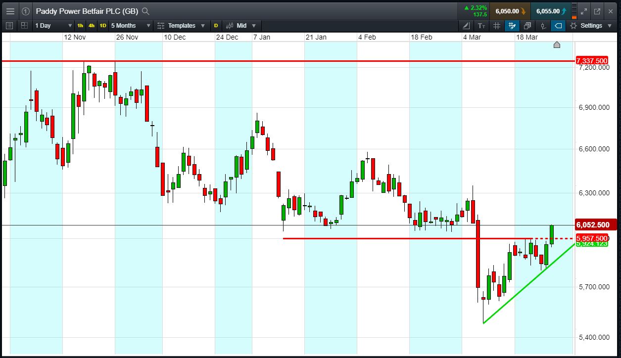 Let’s say the trend appeals to you, you think it’s likely to continue. You decide to buy exposure to £10,000 worth of Paddy Power using a CFD, at the current price of 6052p. To do this, you need £2,000.