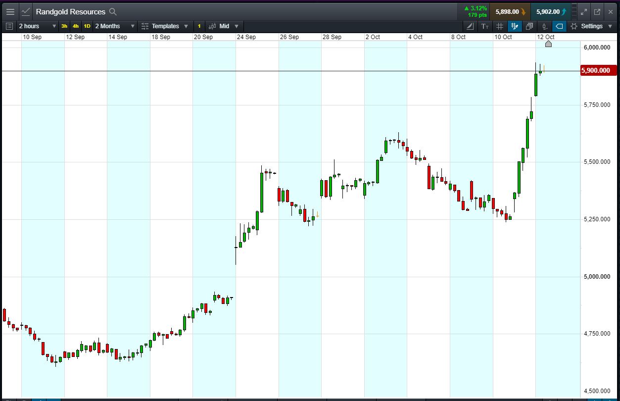 - Shares in a monthlong uptrend from 4,607p lows; now at 5,900p.
