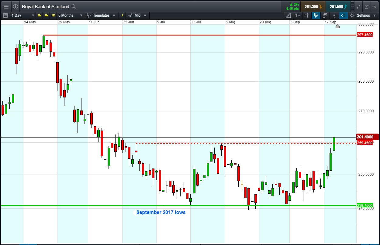 Let’s say the trend appeals to you, you think it’s likely to continue. You decide to buy exposure to £10,000 worth of RBS using a CFD, at the current price of 261p. To do this, you need £2,000.