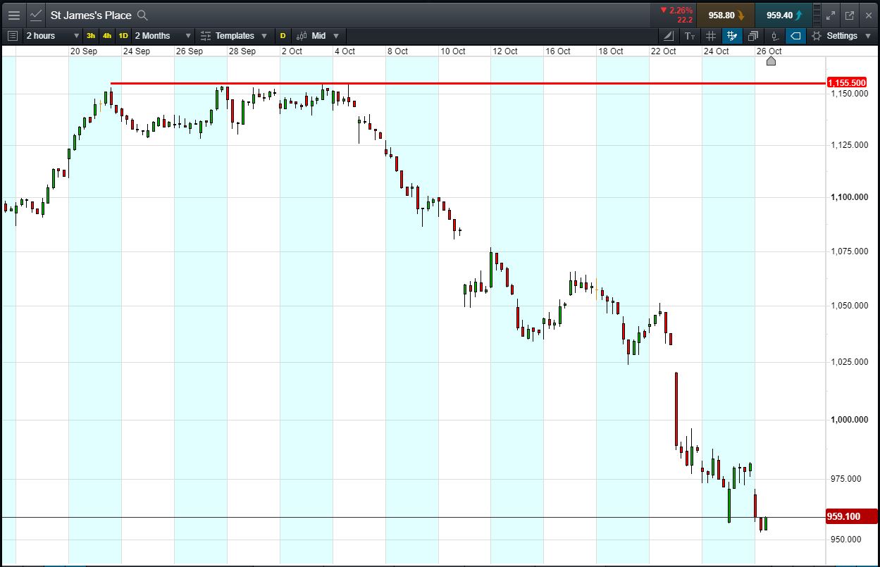 Let’s say the trend appeals to you, you think it’s likely to continue. You decide to sell exposure to £10,000 worth of St James’s Place using a CFD, at the current price of 959p. To do this, you need £2,000.