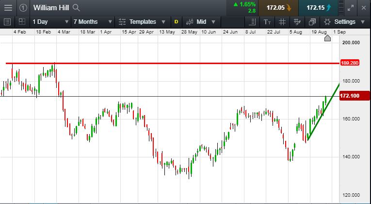 Will William Hill turn, or will it continue to rise to Feb highs of 189p (+15%)?