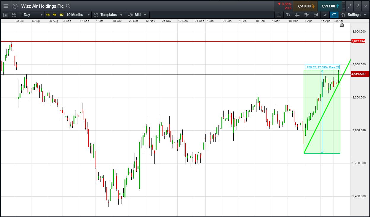 Will Wizz Air turn, or will it continue to rise towards previous highs at 3812p?