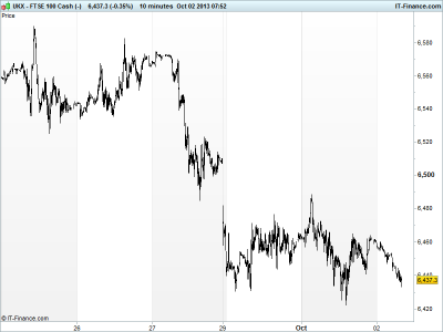 UK 100 called to open -10pts at 6440, still under pressure as we enter day 2 of the US government shutdown, with blame apportioned to Republicans who appear focused on scuppering Obamacare, whatever the cost, and some expecting a long wait and impasse re-run come the deadline for the even more dangerous debt ceiling.