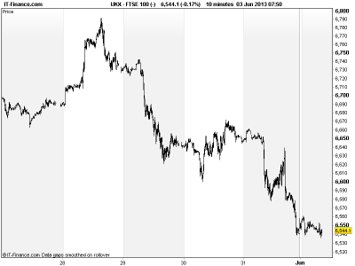 UK 100 called to open -50pts at 6540, taking the correction a stage further (as we proffered last week, 6550 being -5% from recent 13yr highs) with a negative risk-off lead from Friday’s US close on renewed Fed taper fears after some strong US data (Chicago Fed, Uni of Michigan) to close the week and month, despite it increasing hopes of economic recovery and plenty of other data at odds (subdued consumer spend, benign inflation).